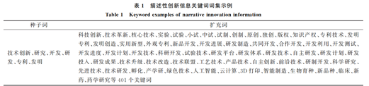 与传统词典法不同,本文采用“种子词集+Word2Vec相似词扩充”方法构建描述性创新信息指标。参考相关文献[11,28],对年报多次研读校验得到种子词集。相较于传统词法,Word2Vec神经网络模型可以根据语义信息将词汇转换为多维向量,并通过计算向量的相似度得到相似词。本文采用其中的CBOW(ContinuousBag-of-wordsModel)模型对中文语料进行训练。描述性创新关键词如见表1所示。