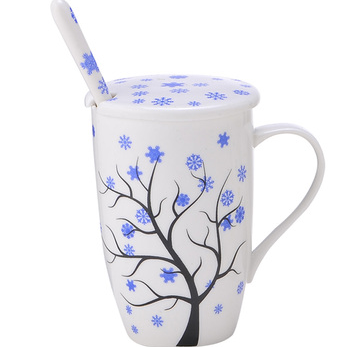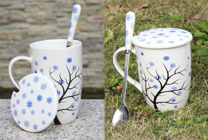 外观:简约的杯身外形、以白色为底色、一棵黑色的树枝为杯身的主图案、大约占杯身面积的三分之一、其余面积以蓝色雪花做点缀、使整个图案更有意境感、杯身图案虽然简洁但不失时尚韵味、