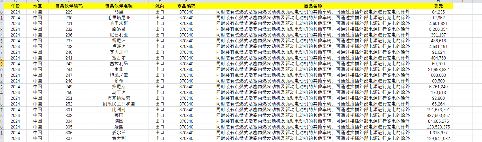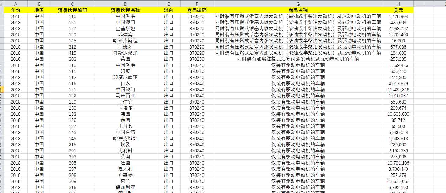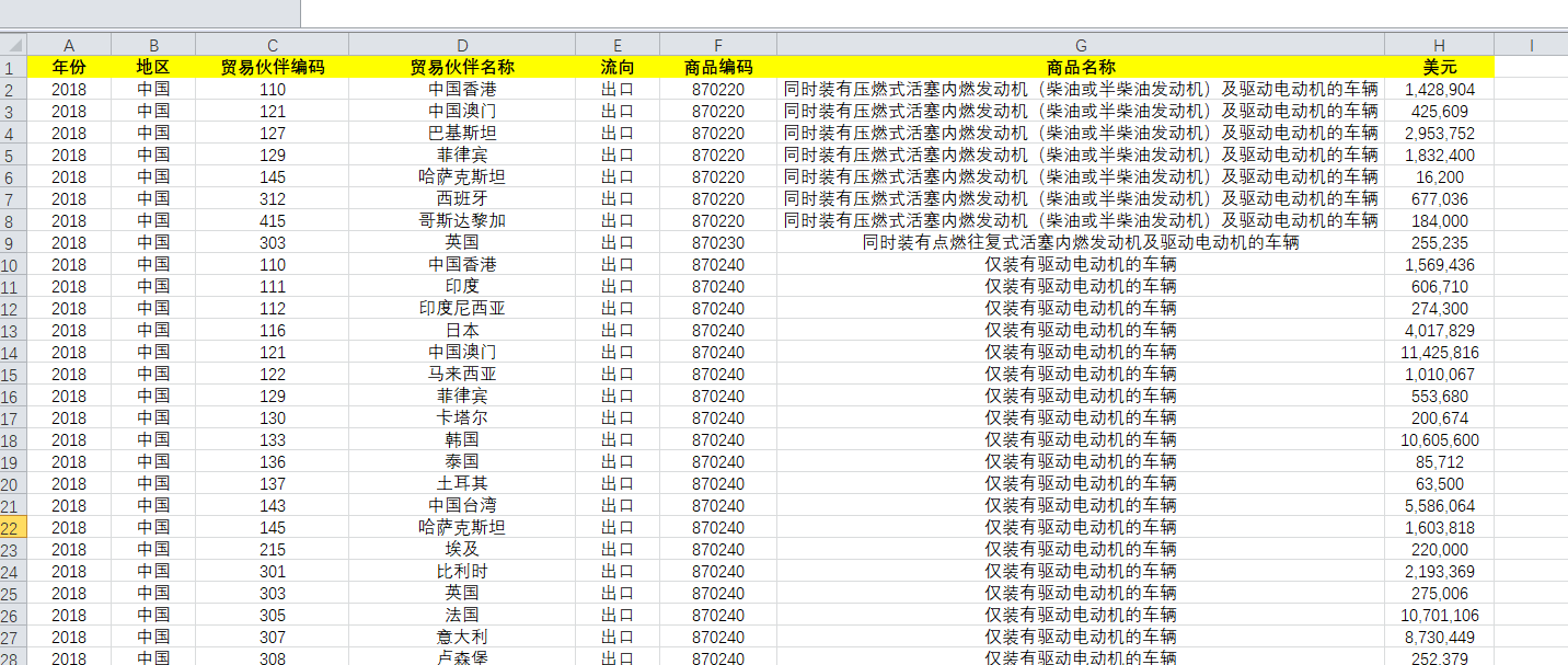 出口:年份 地区 贸易伙伴编码 贸易伙伴名称 流向 商品编码 商品名称 美元