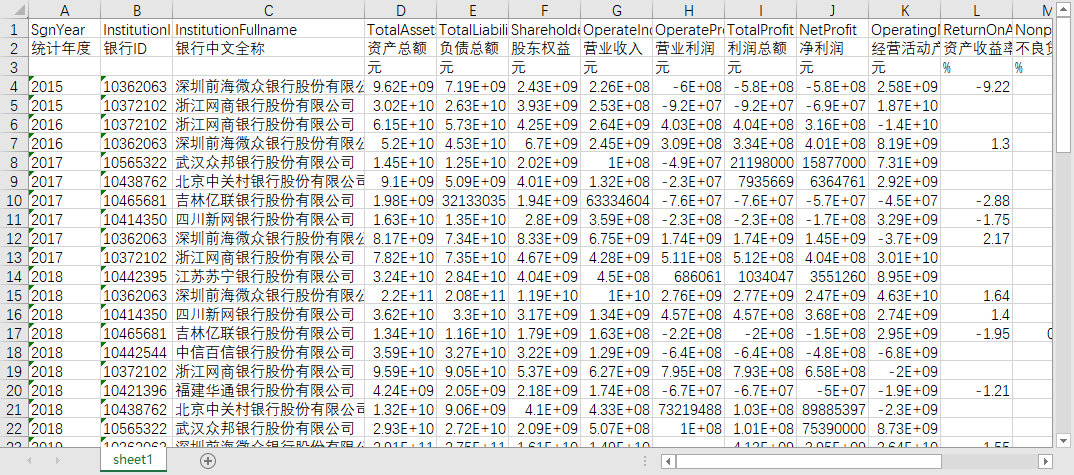 | 统计年度 | 银行ID | 银行中文全称 | 资产总额 | 负债总额 | 股东权益 | 营业收入 | 营业利润 | 利润总额 | 净利润 | 经营活动产生的现金流量净额 | 资产收益率 | 不良贷款率 | 拨备覆盖率 | 贷款拨备率 | 流动性比例 | 资本充足率 | 一级资本充足率 | 核心一级资本充足率 |