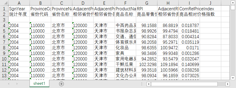 | 统计年度 | 省份代码 | 省份名称 | 相邻省份代码 | 相邻省份名称 | 商品名称 | 商品零售价格指数 | 相邻省份商品零售价格指数 | 商品相对价格指数 |