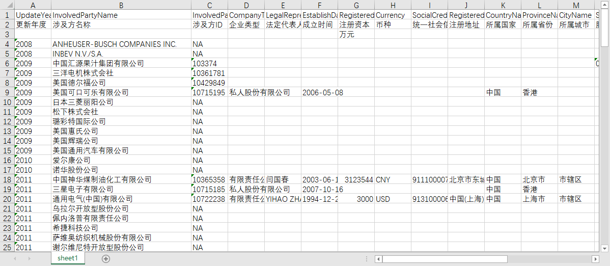 更新年度 涉及方名称 涉及方ID 企业类型 法定代表人 成立时间 注册资本 币种 统一社会信用代码 注册地址 所属国家 所属省份 所属城市 股票代码 上市交易所 经营范围 经营状态 人员规模 行业代码A 行业名称A 行业代码B 行业名称B 行业代码C 行业名称C 曾用名