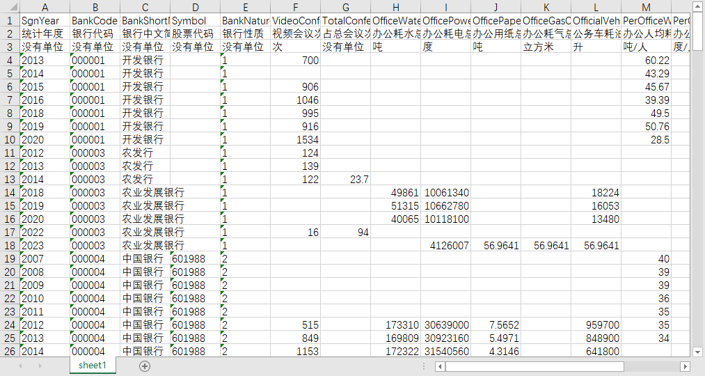 统计年度 银行代码 银行中文简称 股票代码 银行性质 视频会议次数 占总会议次数的比例(%) 办公耗水总量 办公耗电总量 办公用纸总量 办公耗气总量 公务车耗油总量 办公人均耗水量 办公人均耗电量 办公人均用纸量 人均耗气量 公务车人均耗油量