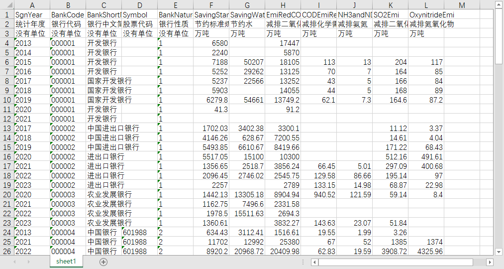 统计年度 银行代码 银行中文简称 股票代码 银行性质 节约标准煤 节约水 减排二氧化碳当量 减排化学需氧量 减排氨氮 减排二氧化硫 减排氮氧化物