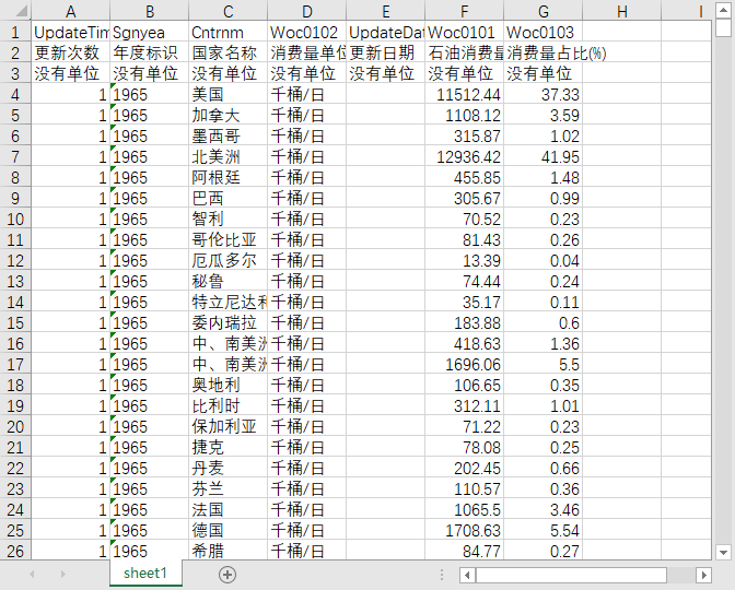 | 更新次数 | 年度标识 | 国家名称 | 消费量单位 | 更新日期 | 石油消费量 | 消费量占比(%) |