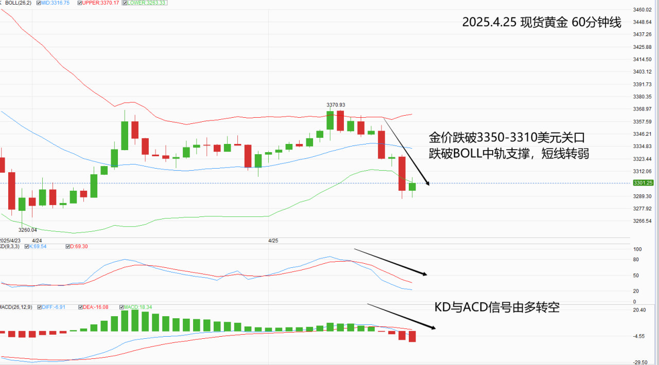 从4小时线图来看,主指标BOLL中性,从60分钟线图来看,现货黄金处于震荡格局,建议激