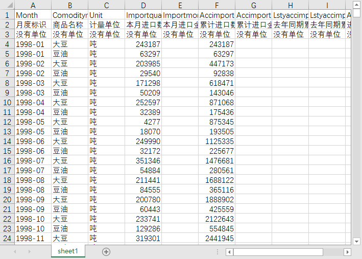 月度标识 商品名称 计量单位 本月进口数量 本月进口金额 累计进口数量 累计进口金额 去年同期累计进口数量 去年同期累计进口金额 进口数量累计比去年同期增减 进口金额累计比去年同期增减