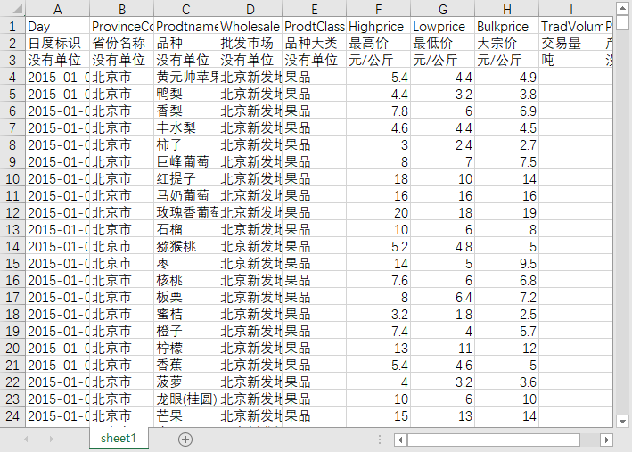 | 日度标识 | 省份名称 | 品种 | 批发市场 | 品种大类 | 最高价 | 最低价 | 大宗价 | 交易量 | 产地 |