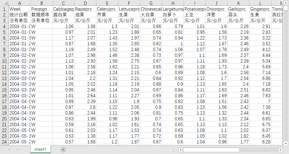 统计日期 数据频率 圆白菜 油菜 芹菜 生菜 大白菜 白萝卜 土豆 洋葱 蒜头 生姜 西红柿 黄瓜 茄子 辣椒 青椒 豆角 冬瓜 苦瓜