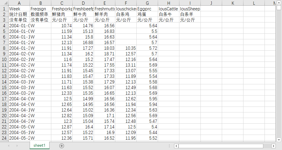 统计日期 数据频率 鲜猪肉 鲜牛肉 鲜羊肉 白条鸡 鸡蛋 白条牛 白条羊
