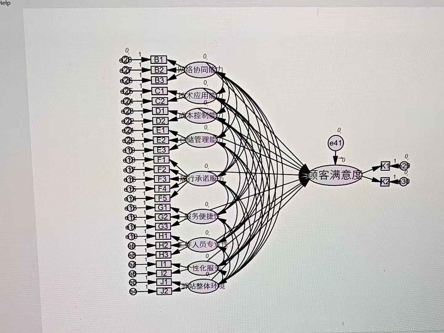 左边的9个分别是前四个是物流能力,后五个是服务质量,右边是顾客满意度,三者的关系是物流能力、服务质量对顾客满意度是正相关。不论证物流能力和服务质量之间的关系