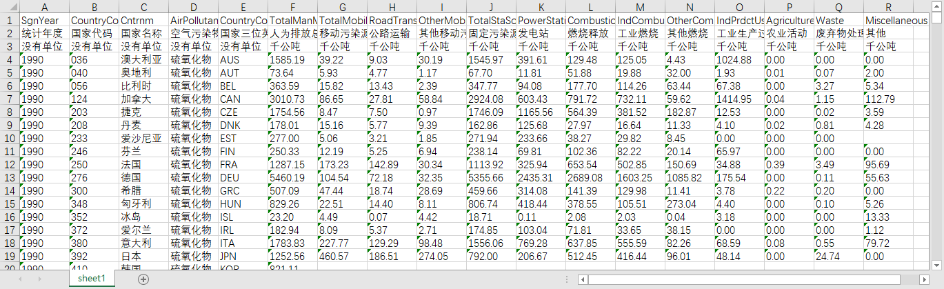| 统计年度 | 国家代码 | 国家名称 | 空气污染物名称 | 国家三位英文代码 | 人为排放总量 | 移动污染源排放总量 | 公路运输 | 其他移动污染源 | 固定污染源排放总量 | 发电站 | 燃烧释放 | 工业燃烧 | 其他燃烧 | 工业生产过程和产品使用 | 农业活动 | 废弃物处理 | 其他 |