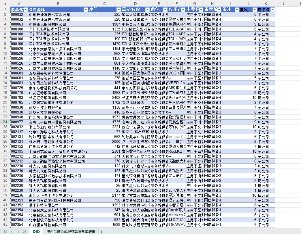 大麦、图形起源、智谱华章、美团、快手、百度、抖音、出门问问、淘票票、阿里巴巴、天猫、钉钉、阿里达摩院、拣值了、淘宝、菜鸟物流、科大讯飞、美图科技、动景科技、网易、酷狗、音书、鹏中科技、腾讯、腾讯音乐、闪剪智能等公司的算法均在境内深度合成服务算法备案清单之列。