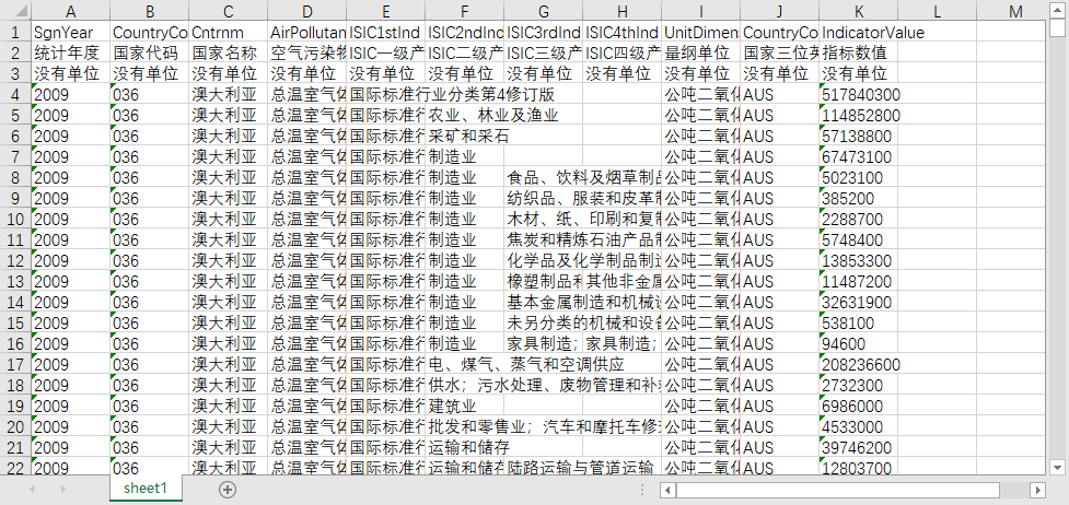 | 统计年度 | 国家代码 | 国家名称 | 空气污染物名称 | ISIC一级产业分类名称 | ISIC二级产业分类名称 | ISIC三级产业分类名称 | ISIC四级产业分类名称 | 量纲单位 | 国家三位英文代码 | 指标数值 |