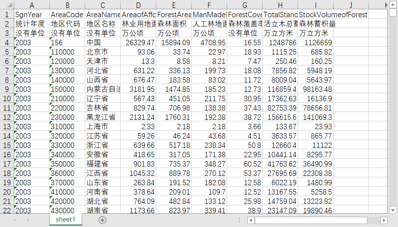 全球暖化中国森林覆盖率和蓄积量表分省份地区2003-2023森林面积人工林地面积活立木总蓄积量