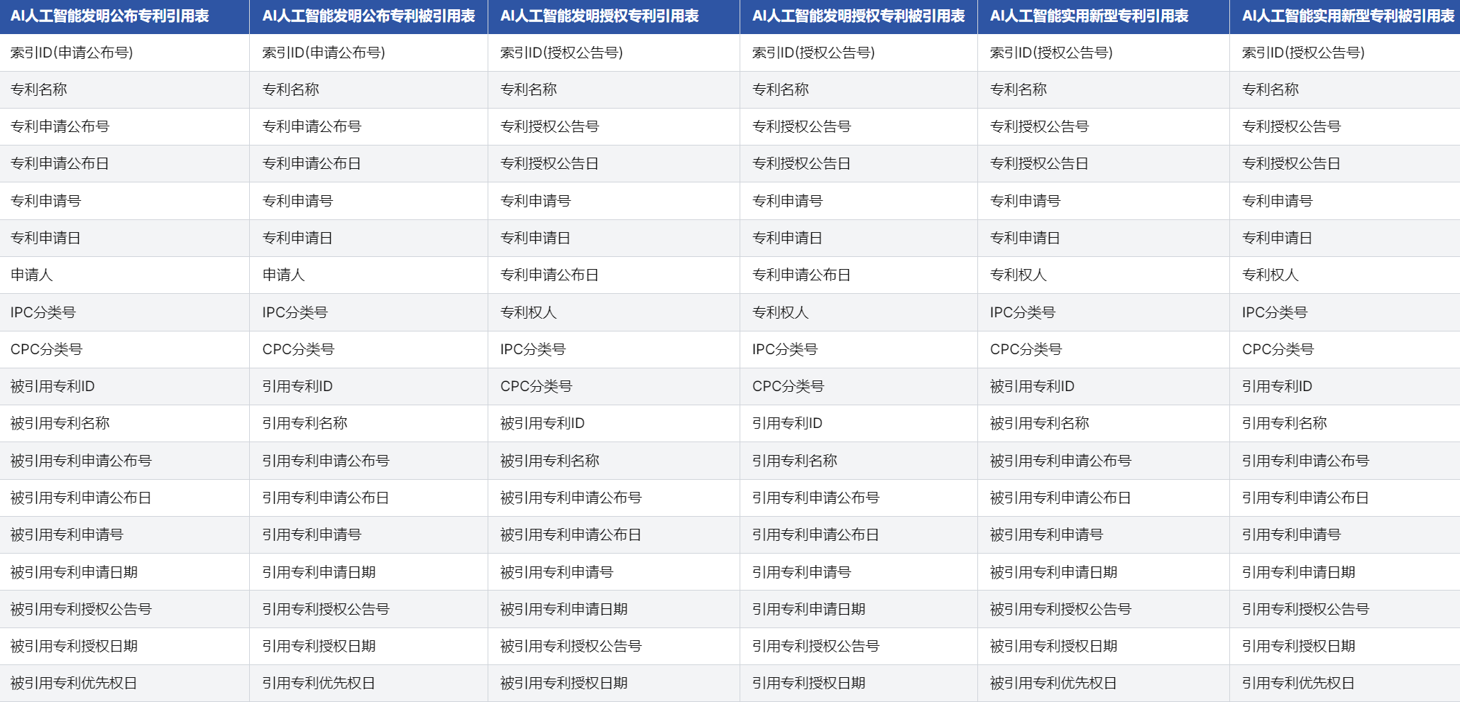 本数据库聚焦中国人工智能领域专利信息,依据自主构建的双重关键词词库与《关键数字技术专利分类体系(2023)》等双重标准,系统整合全球专利及引用被引信息。核心内容包括: