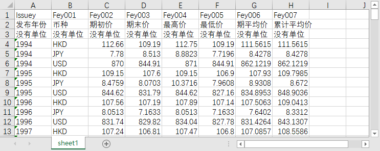 发布月份 币种 期初价 期末价 最高价 最低价 期平均价 累计平均价