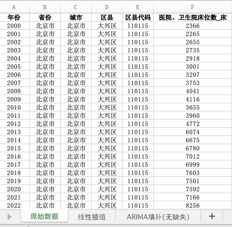 年份 | 省份 | 城市 | 区县 | 区县代码 | 医院、卫生院床位数_床