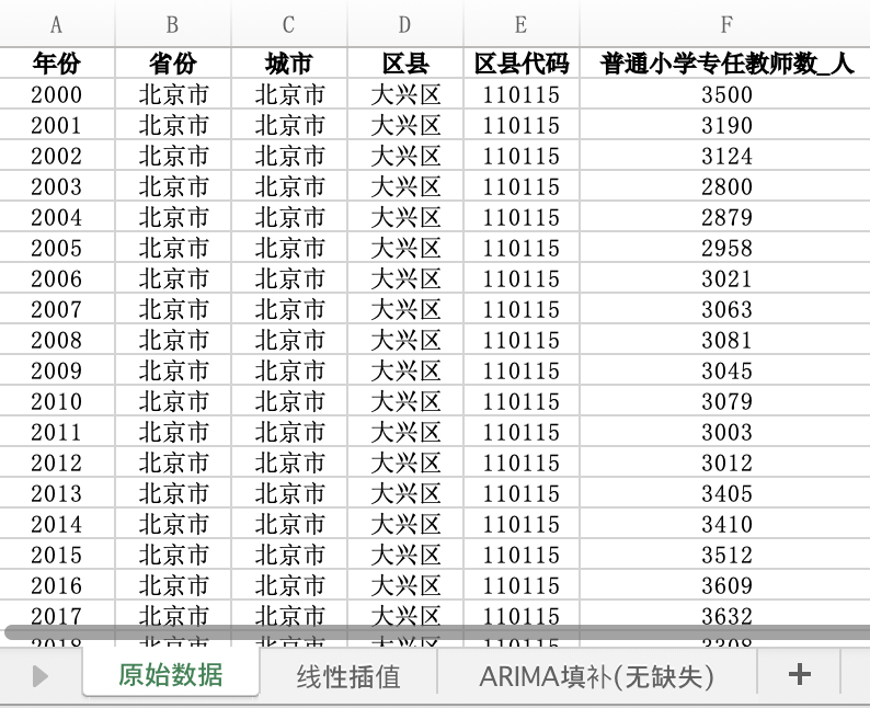 年份 | 省份 | 城市 | 区县 | 区县代码 | 普通小学专任教师数_人