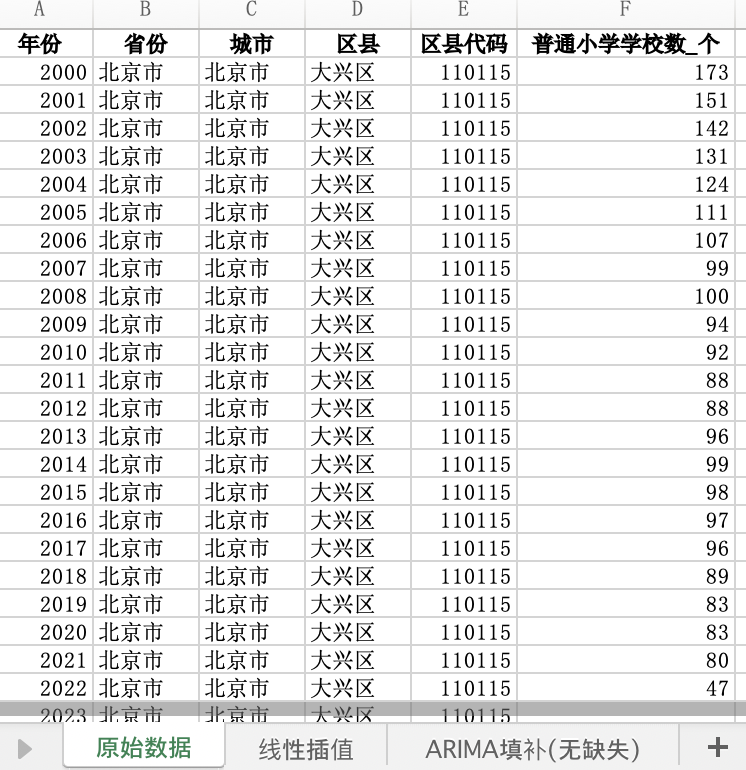 年份 | 省份 | 城市 | 区县 | 区县代码 | 普通小学学校数_个