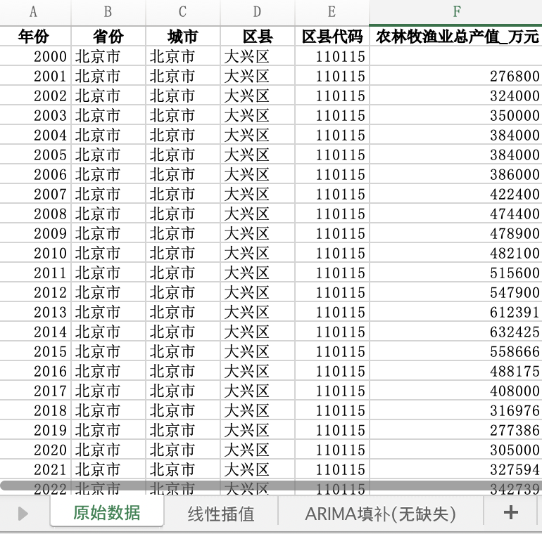 年份 | 省份 | 城市 | 区县 | 区县代码 | 农林牧渔业总产值_万元