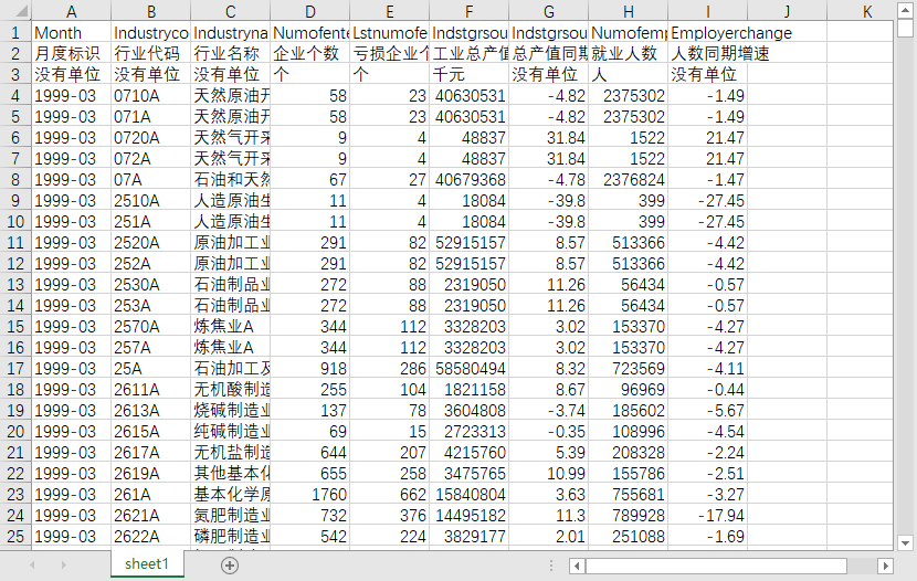 | 月度标识 | 行业代码 | 行业名称 | 企业个数 | 亏损企业个数 | 工业总产值 | 总产值同期增速 | 就业人数 | 人数同期增速 |