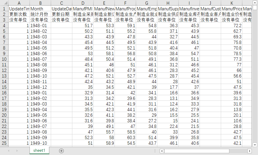 更新次数 统计月份 更新日期 制造业采购经理人指数 制造业新订单指数 制造业生产指数 制造业就业指数 制造业供应商交付指数 制造业库存指数 制造业客户库存指数 制造业价格指数 制造业积累订单指数 制造业新出口订单指数 制造业进口指数