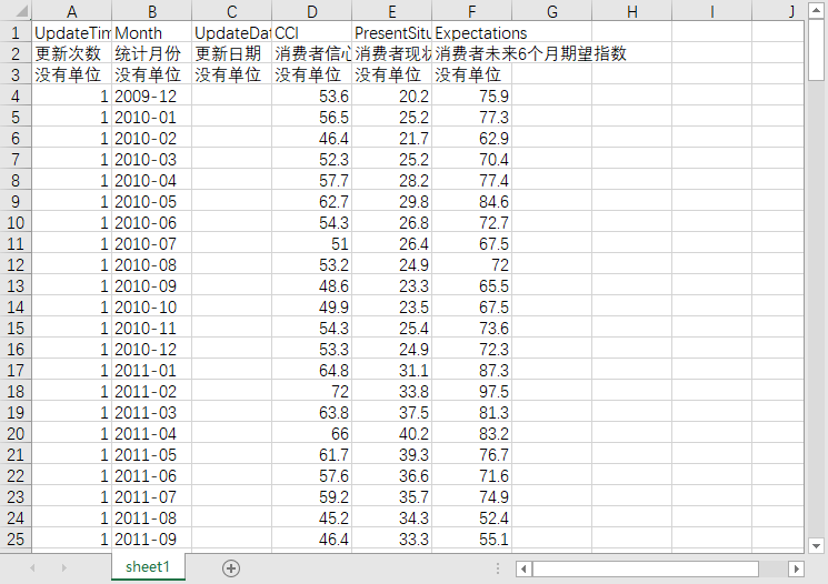 更新次数 统计月份 更新日期 消费者信心指数 消费者现状指数 消费者未来6个月期望指数