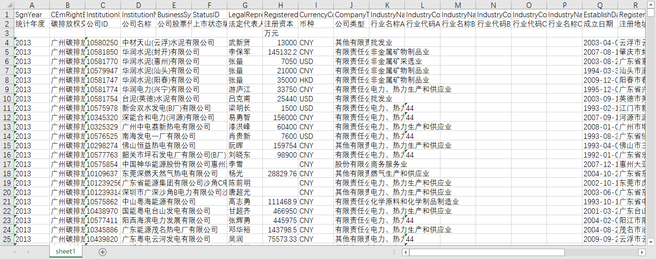 统计年度 碳排放权交易所 公司ID 公司名称 公司股票代码 上市状态编码 法定代表人 注册资本 币种 公司类型 行业名称A 行业代码A 行业名称B 行业代码B 行业代码C 行业名称C 成立日期 注册地址 所属省份 所属城市 人员规模 参保人数 曾用名 经营范围 统一社会信用代码