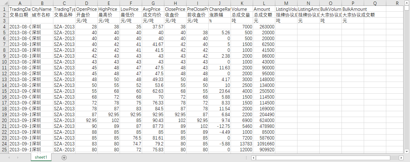 交易日期 城市名称 交易品种 开盘价 最高价 最低价 成交均价 收盘价 前收盘价 涨跌幅 总成交量 总成交额 挂牌协议成交量 挂牌协议成交额 大宗协议成交量 大宗协议成交额