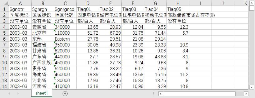季度标识 区域标识 地区代码 固定电话普及率 城市电话普及率 住宅电话普及率 移动电话普及率 邮政储蓄市场占有率(%)