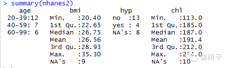 可以看到bmi、hyp、chl分别有9、8、10 个缺失值