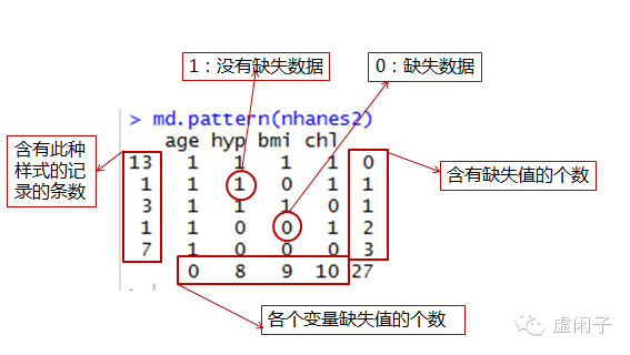 4 观察数据集中缺失值是否随机(可以利用mice包中md.pattern函数来完成)