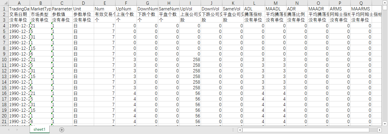 交易日期 市场类型 参数值 参数单位 有效交易个数 上涨个数 下跌个数 平盘个数 上涨公司交易量 下跌公司交易量 平盘公司交易量 腾落指标 平均腾落指标 腾落比例 平均腾落指数 阿姆士指标 平均阿姆士指标