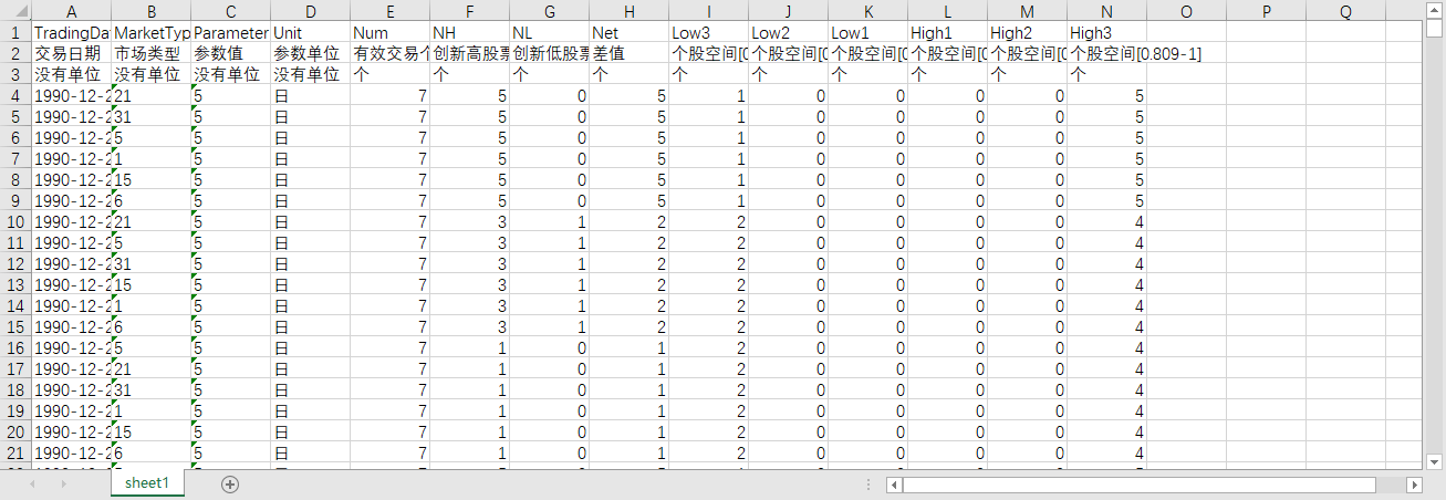 交易日期 市场类型 参数值 参数单位 有效交易个数 创新高股票个数 创新低股票个数 差值 个股空间[0-0.191) 个股空间[0.191-0.382) 个股空间[0.382-0.5) 个股空间[0.5-0.618) 个股空间[0.618-0.809) 个股空间[0.809-1]