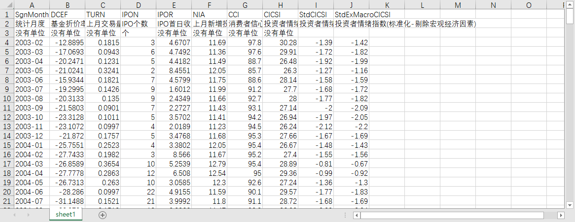 统计月度 基金折价率(%) 上月交易量 IPO个数 IPO首日收益 上月新增投资者开户数 消费者信心指数 投资者情绪指数 投资者情绪指数(标准化) 投资者情绪指数(标准化-剔除宏观经济因素)
