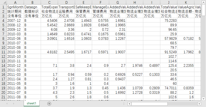 统计期间 数据标识 社会物流总费用 运输费用 保管费用 管理费用 物流业增加值 物流业增加值-交通运输业 物流业增加值-贸易业增加值 社会物流总额 物流总额-农产品 物流总额-工业品 物流总额-进口货物 物流总额-再生资源 物流总额-单位与居民物品 物流相关行业总固定资产投资 固定资产投资-交通运输业 固定资产投资-仓储邮政业 固定资产投资-贸易业 重点物流企业主营业务利润率(%)