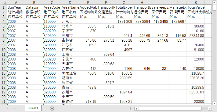 统计期间 数据标识 省份地区代码 地区名称 区域物流增加值 交通运输、邮政、仓储业增加值 社会物流总费用 运输费用 保管费用 管理费用 区域社会物流总额