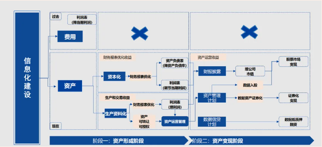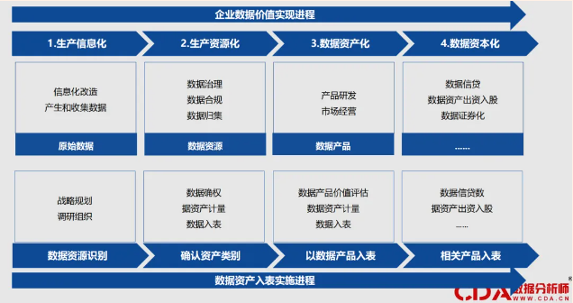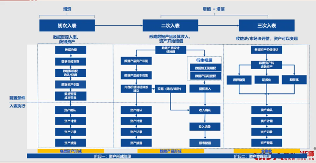 数据资产化: 通过数据产品研发、市场经营,结合数据确权、计量和入表,将数据资源转化为数据资产 。这个阶段可分为初次入表(底层资产形成)、二次入表(数据产品形成并开始增值) 。