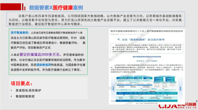 数据要素 x 医疗健康: 山西省吕梁市数据局利用其获得运营授权的医疗数据,进行数据治理和应用场景设计后,成功实现了数据资产入表,登记价值超2000万元 。