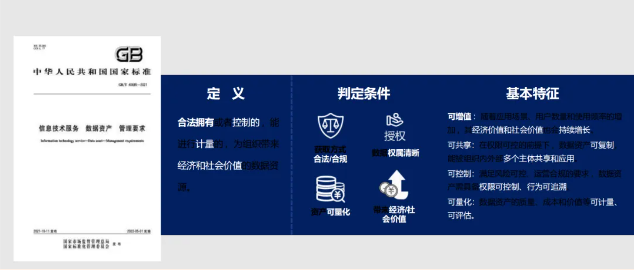 根据国家标准 (GB/T 42015-2021),数据资源要成为数据资产,需满足“合法拥有或控制”、“能进行计量”并“能带来经济和社会价值”的条件 。数据资产具有可增值、可共享、可控制、可量化的基本特征 。