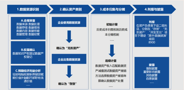 财务流程: 包括数据资源识别(合规审查、权属确认、预期经济利益分析)、确认资产类别(无形资产或存货)、成本归集与分摊(初始计量、后续计量)以及最终的列报与披露 。
