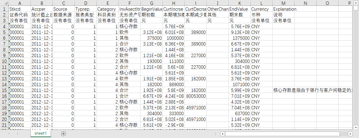 | 证券代码 | 统计截止日期 | 数据来源 | 报表类型 | 科目类别 | 无形资产项目 | 期初数 | 本期增加数 | 本期减少数 | 其他 | 期末数 | 币种 | 说明 |