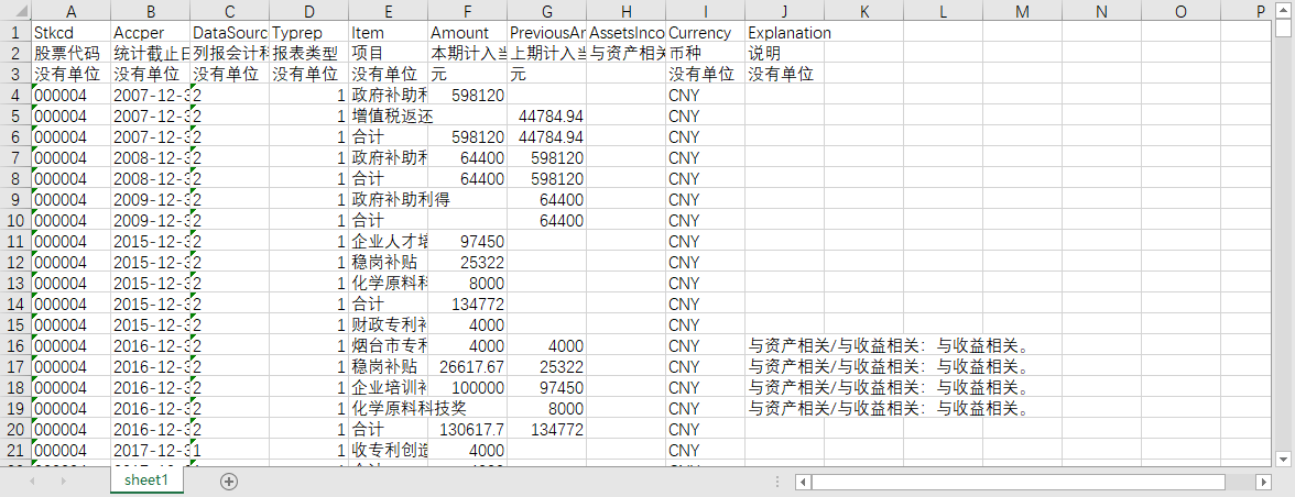 | 股票代码 | 统计截止日期 | 列报会计科目 | 报表类型 | 项目 | 本期计入当期损益的金额 | 上期计入当期损益的金融 | 与资产相关/与收益相关 | 币种 | 说明 |