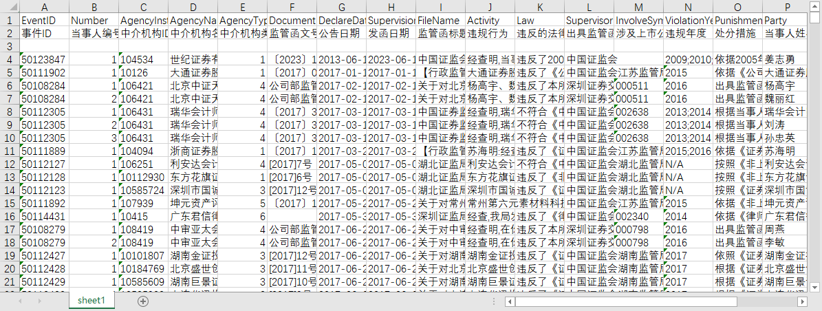 事件ID 当事人编号 中介机构ID 中介机构名称 中介机构类别 监管函文号 公告日期 发函日期 监管函标题 违规行为 违反的法律法规 出具监管函机构 涉及上市公司代码 违规年度 处分措施 当事人姓名 当事人职务 处罚方式编码 处罚方式
