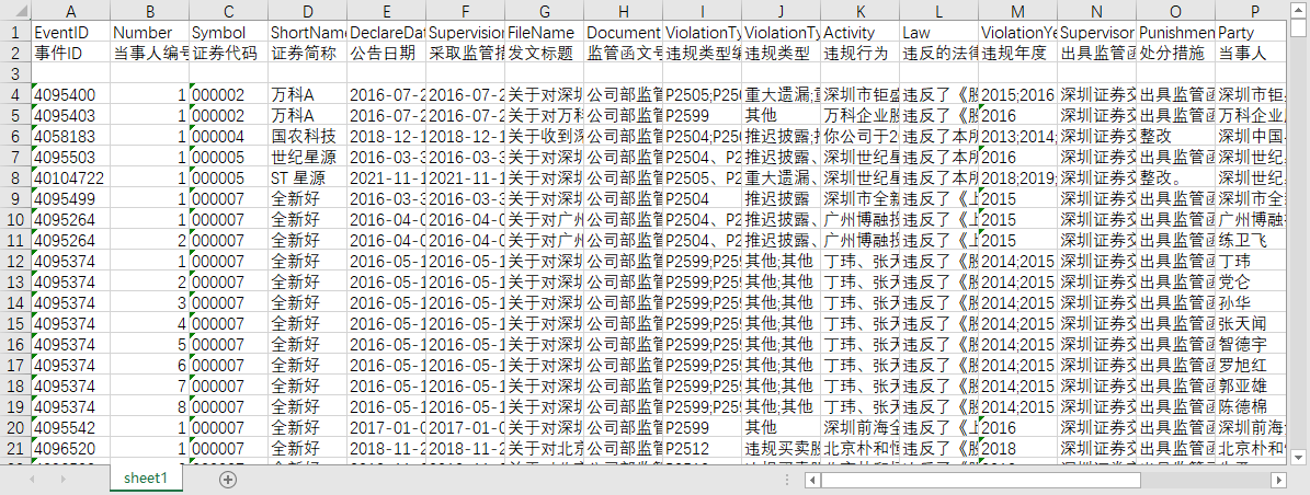 事件ID 当事人编号 证券代码 证券简称 公告日期 采取监管措施日期 发文标题 监管函文号 违规类型编码 违规类型 违规行为 违反的法律法规 违规年度 出具监管函机构 处分措施 当事人 当事人职务 与上市公司关系编码 与上市公司关系 处罚方式编码 处罚方式