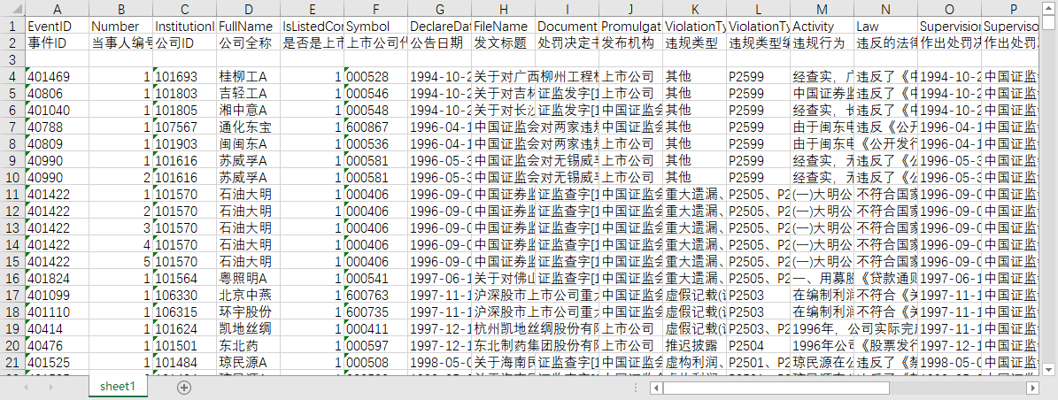 事件ID 当事人编号 公司ID 公司全称 是否是上市公司 上市公司代码 公告日期 发文标题 处罚决定书文号 发布机构 违规类型 违规类型编码 违规行为 违反的法律法规 作出处罚决定的日期 作出处罚决定的机构 处分措施 当事人 当事人职务 与上市公司关系编码 与上市公司关系 处罚方式编码 处罚方式 处罚金额