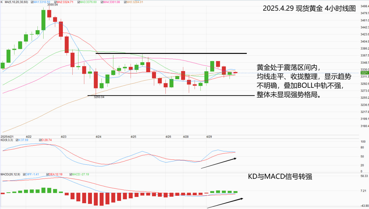 从日线图来看,5MA走平、20MA走平,副指标KD中性偏空,现货黄金为震荡格局。从4小时线图来看,主指标BOLL中性或中性偏空,从60分钟线图来看,现货黄金处于震荡格局,建议激进者偏空操作。