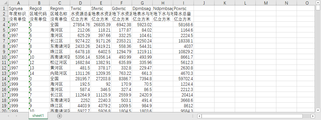 年度标识 区域代码 区域名称 水资源总量 地表水资源量 地下水资源量 地表水与地下水资源重复量 地下水与地表水资源不重复量 降水总量