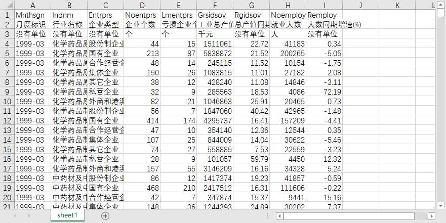 | 月度标识 | 行业名称 | 企业类型 | 企业个数 | 亏损企业个数 | 工业总产值 | 总产值同期增速(%) | 就业人数 | 人数同期增速(%) |